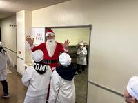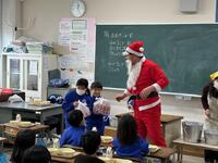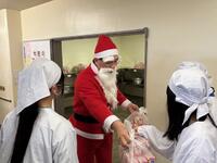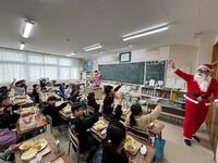 この日はクリスマス給食ということで、チキンライス、もみの木チキン、星のチーズサラダ、冬色ポトフ、牛乳、イチゴのクリスマスケーキというメニューでした。子どもたちは、サンタクロースからクリスマスケーキを受け取って大喜びでした。