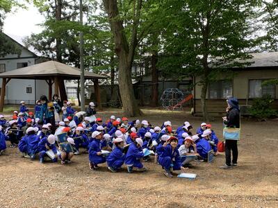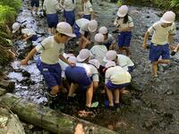 小岩井の森を探検しました。100年の杉の前でみんなで写真を撮ったり、川遊びをしたりしました。川遊びでは、カワシンジュやサワガニなどを一生懸命探していました。見つけた生き物は見せ合って観察して川に戻しました。