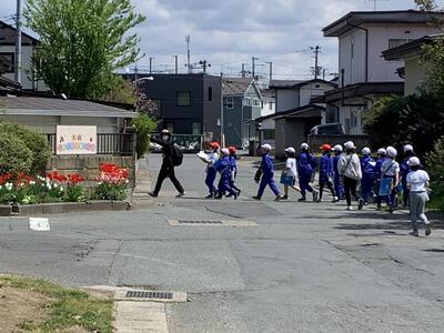 23日は、学校の西側を中心に町の様子を見学しました。大新遊園の前を通り、中堤町・大館町方面へ向かいました。大館児童公園で休憩した後、学校へ戻りました。