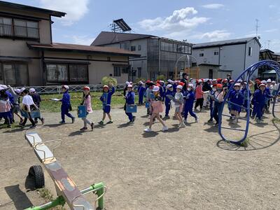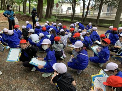 子ども達は、「前にこのお店来たことある。」とか「車がいっぱい走っている。」「家がいっぱい」などなどたくさんのことに気づきながら、学区内を見て回りました。これからの社会科の時間に気づいたことを共有しながら、町の様子の学びを深めてほしいと思います。